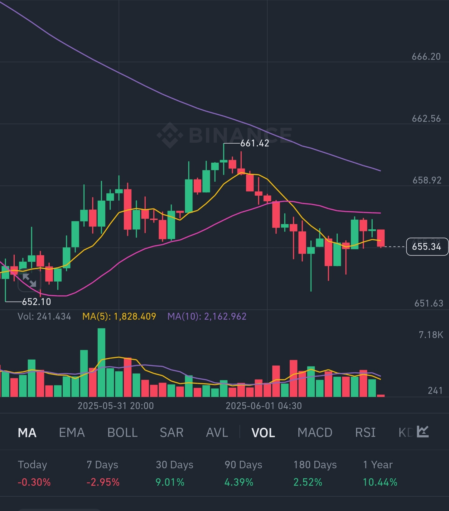 À partir du 1er juin 2025, à 11h02, Binance Coin (BNB) se négocie à 655,34 $, montrant un léger mouvement à la hausse de +0,33 % au cours des dernières 24 heures. La paire a enregistré un sommet de 24h à 661,42 $ et un creux à 652,10 $, reflétant une certaine volatilité intrajournalière. Examinons de plus près le graphique et les données de volume pour prévoir une éventuelle action des prix pour BNB/USDT à court terme.