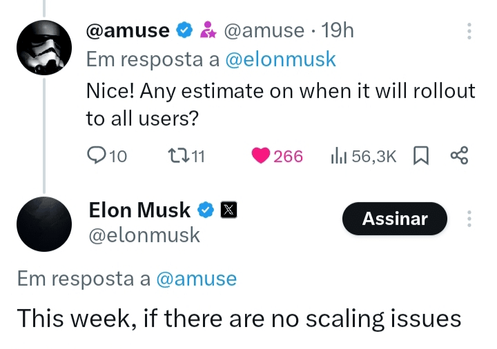 â ïž Elon a Ă©galement rĂ©pondu Ă un utilisateur de X en disant que le XChat pourrait ĂȘtre lancĂ© dans une semaine s'il n'y a pas de retard.