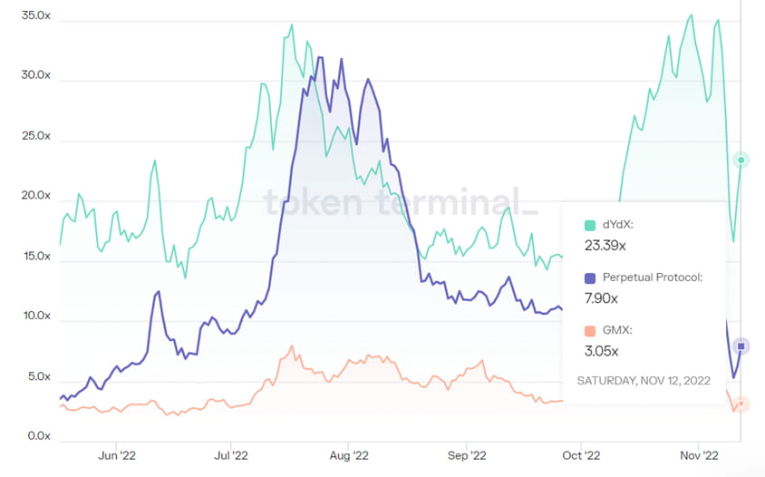 从过往6个月完全稀释市值/手续费估值看,GMX同样处于估值较低区间。