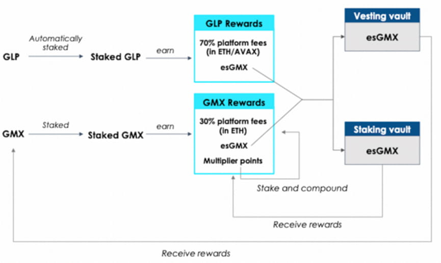 此外GMX的代币经济还引入了Escrowed GMX和乘点来鼓励长期持有,详情如下: