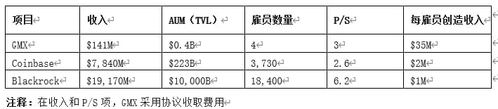更大的想象空间来自去DeFi利用智能合约取代金融中介,从而为用户减少“中间人”支出:GMX这一创造百亿美元交易规模的链上交易所,起初核心团队却仅只有4人,其余均由社区自发建设。与传统金融机构和科技企业对比,GMX单位雇员创造收入更高,估值也更低。若DeFi的技术最终能从加密货币领域破圈,将有更大的增长空间和潜力。
