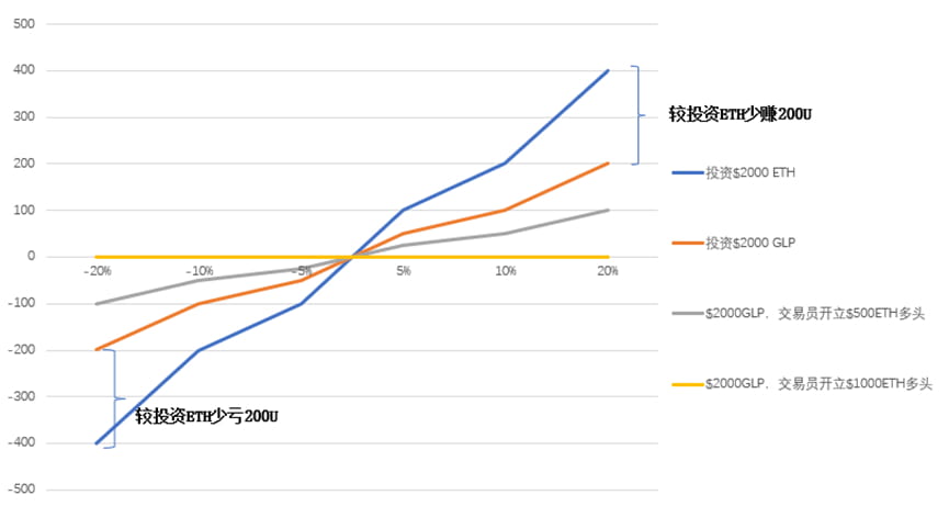 下表模拟资产价格变动和交易者盈利/亏损对GLP的影响:假设2000美元购买GLP(假设ETH和稳定币各50%)。GLP在ETH在上涨时赚的更少,下跌时也亏得更少。交易者对ETH的利用部分抵消GLP相应风险资产的波动,当利用率达到100%时,GLP价格较U保持恒定。理论上GLP永远可以兑付交易者的盈利和亏损,且投资GLP盈亏较直接购买风险资产更小。