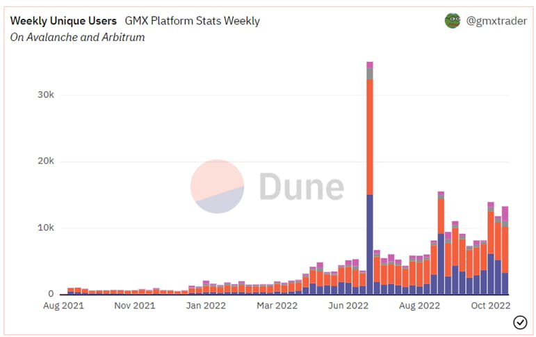 用户量:目前累计用户15.5万名,每周交易用户约1.5万人。2022年6月的Arbitrum的奥德赛活动给GMX带来一波用户高峰。