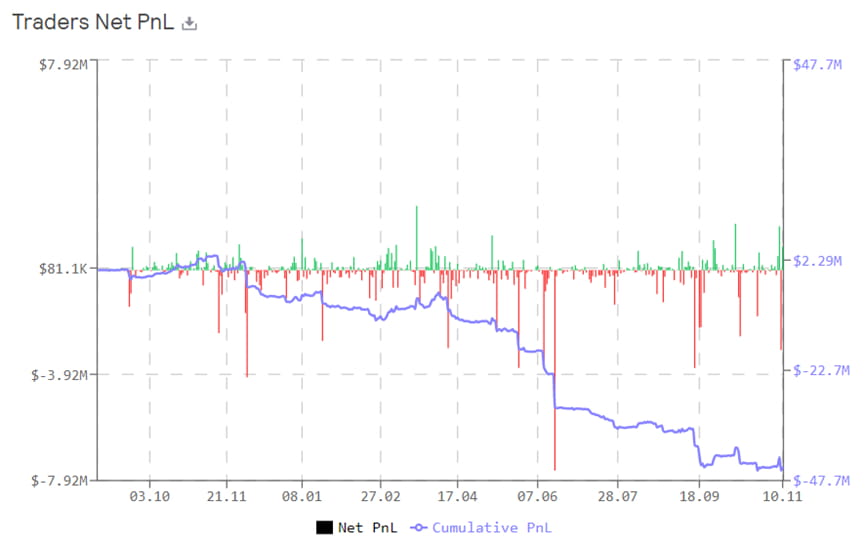 图表 6:历史上看,GMX交易者累计亏损,对应GLP从中获益