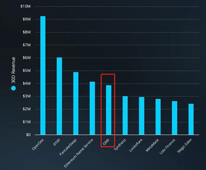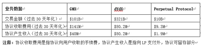 根据过去30天交易金额,dYdX交易额排第一,GMX约为dYdX的1/3。但从协议收取费用角度,GMX则为第一,这是由于dYdX对新用户,其代币持有者提供较多交易费减免。