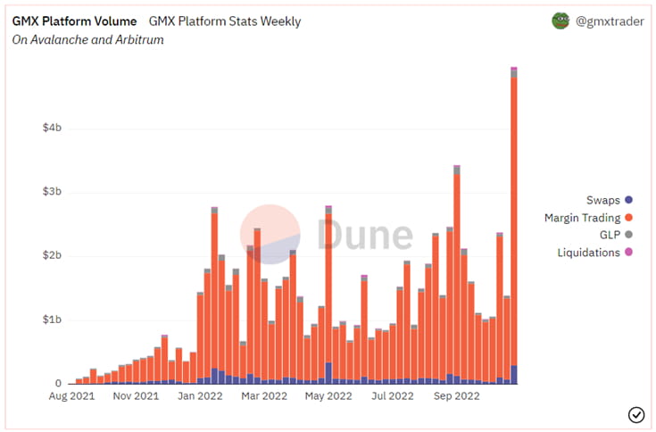 2021年11月:上线3个月,GMX交易额达到65亿美元。在Avalanche上部署了合约。与借贷平台Olympus Pro达成了合作