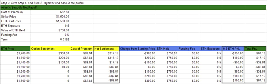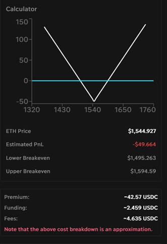 Un straddle est une stratégie dans laquelle les acheteurs d'options à la hausse et à la baisse peuvent profiter. Elle consiste généralement en une option d'achat dans le cours et une option de vente avec le même prix d'exercice, la même date d'expiration et le même actif sous-jacent. Dans les options Atlantic, l'acheteur n'achète qu'une seule option, puis emprunte 50 % de la garantie pour acheter l'actif sous-jacent. Cela permet d'obtenir les caractéristiques de pertes limitées dans les options straddle et de bénéfices en cas de hausse et de baisse des prix. Comme le montre la figure ci-dessous : Achetez une option de vente pour 1 unité ETH et empruntez 50 % de la garantie pour acheter un straddle de 0,5 ETH. L'acheteur peut réaliser un profit si le prix fluctue de plus de 11 %.