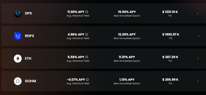 Les investisseurs peuvent engager des devises uniques (ETH, GOHM, DPX, RDPX) dans le coffre-fort d'options pour gagner des intérêts et obtenir des JAssets. Lors du retrait, les jetons JAssets sont détruits et les actifs sont restitués. Le coffre-fort d'options de Jones DAO investit toujours dans Dopex SSOV, mais son affichage du taux de retour est plus intuitif que Dopex. Et Jones a résolu le problème de l'incapacité des options européennes à sortir à mi-chemin. JAssets utilise un concept similaire à la valeur nette d'un fonds pour permettre le transfert d'actions avant l'expiration, améliorant ainsi la liquidité.