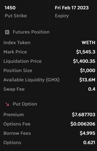 Atlantic Options a coopéré avec GMX comme assurance pour les contrats perpétuels : en supposant que mon contrat long soit liquidé lorsque l'ETH tombe à 1 500, je peux déposer suffisamment d'ETH pour compléter la marge, ou je peux acheter une option de vente avec un prix d'exercice de 1 550 sur Dopex comme assurance : lorsque le prix chute à 1 550, le robot déposera la garantie du vendeur d'option dans le contrat GMX pour s'assurer qu'il ne sera pas liquidé et n'occupera pas moins de fonds. Dopex facturera environ 1,5 % du volume des transactions contractuelles qui fournissent une assurance pour GMX comme frais de traitement, et le volume mensuel des transactions de GMX est d'environ 4 milliards de dollars américains. En supposant que 10 % du volume des transactions contractuelles utilise l'assurance d'options Atlantic de Dopex, cela rapportera. chaque revenu mensuel de 6 millions de dollars.