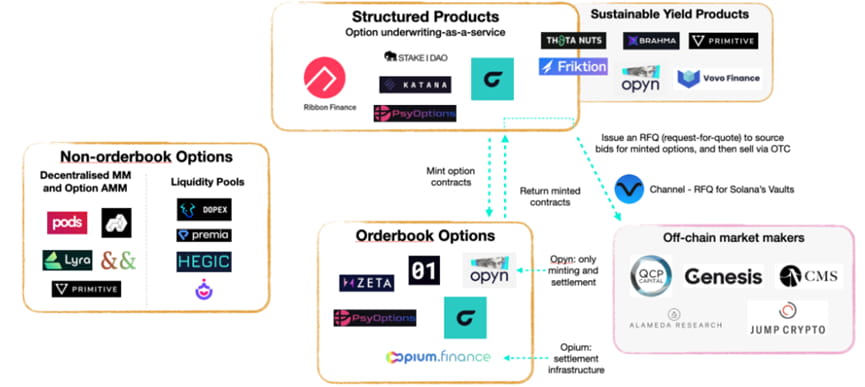 Dès 2019, Opyn a commencé à lancer un marché d'options basé sur le carnet d'ordres de l'ETH. Cependant, en raison des frais de gaz élevés et des écarts acheteur-vendeur très importants, il n'y avait pas beaucoup d'utilisateurs de trading actifs et s'est tourné vers le développement. de produits structurés. Parmi les autres marchés d'options qui utilisent des carnets d'ordres figurent Zeta Markets sur Solana et Lyra, le marché d'options de type AMM sur Optimism.