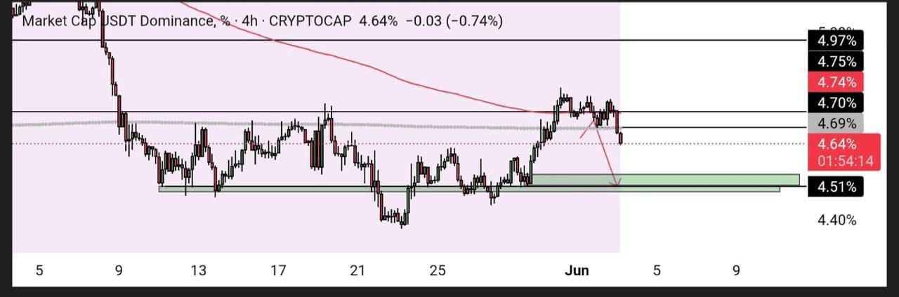 Tant que 4,69 % tient comme rĂ©sistance, la rĂ©gion 4,48 %â4,51 % agit comme un support clĂ© pour USDT.D.