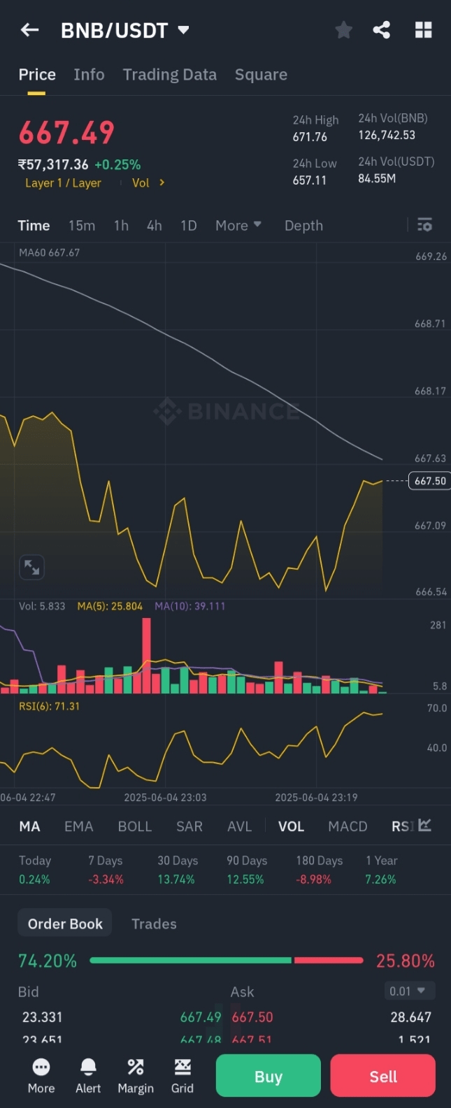 Au 5 juin 2025, Binance Coin ($BNB ) se négocie à environ 667,97 $, reflétant une augmentation de 0,48 % par rapport à la clôture précédente. Le point haut intrajournalier a atteint 671,69 $, tandis que le point bas était de 659,66 $.