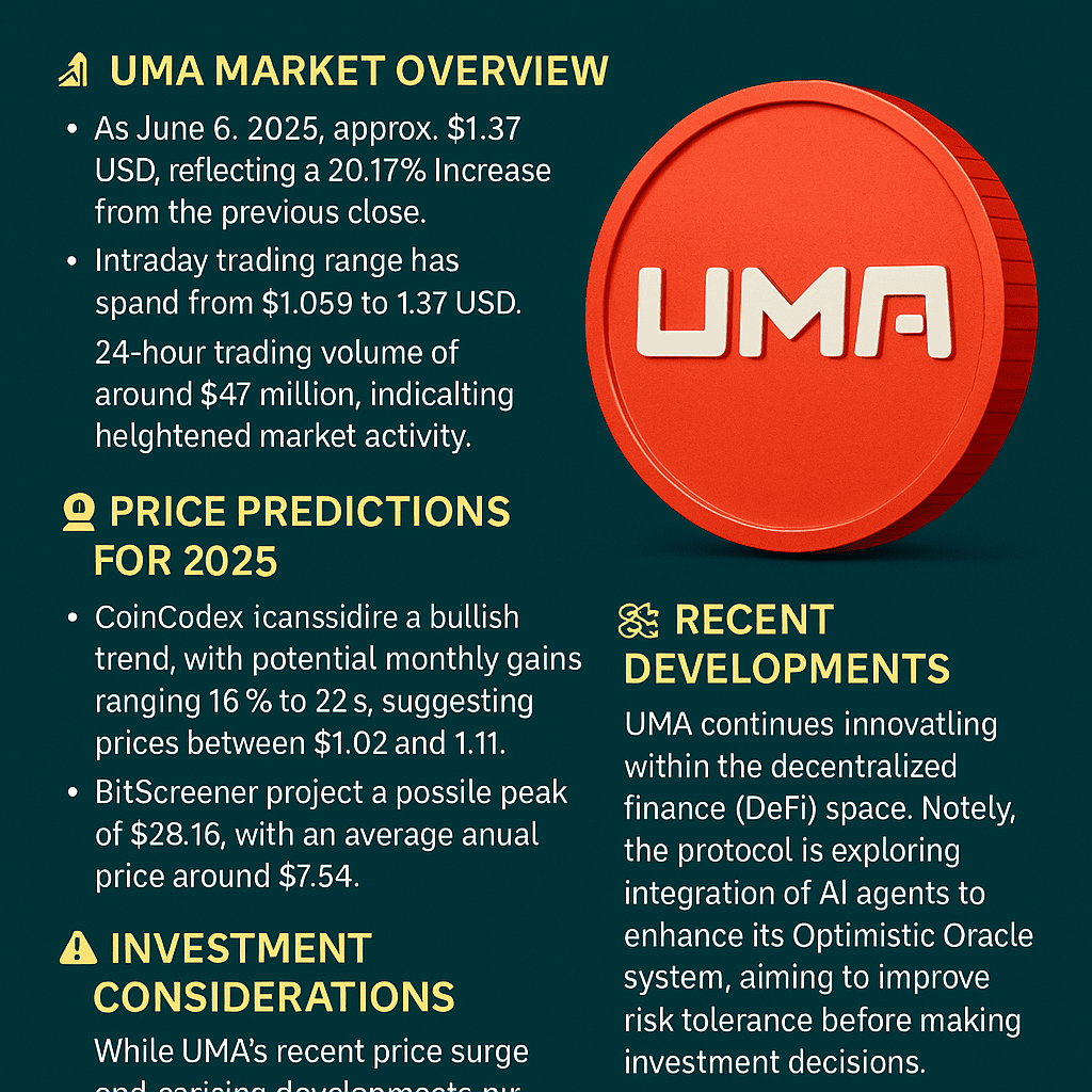 Au 6 juin 2025, UMA$UMA (Accès Universel au Marché) se négocie à environ 1,37 USD, reflétant une augmentation de 20,17 % par rapport à la clôture précédente. La plage de négociation intrajournalière a varié de 1,059 $ à 1,37 USD. Cette hausse est accompagnée d'un volume de négociation sur 24 heures d'environ 47 millions de dollars, indiquant une activité de marché accrue.