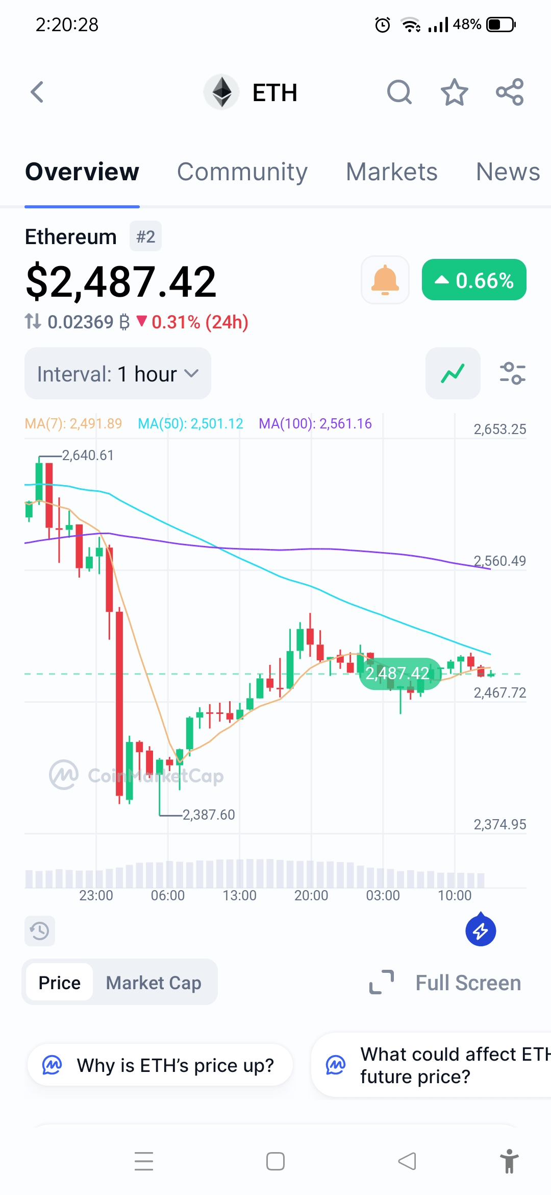 Au 7 juin 2025, Ethereum (ETH) se négocie à environ $2,487.45, reflétant une augmentation modeste de 0.73 % au cours des 24 dernières heures.