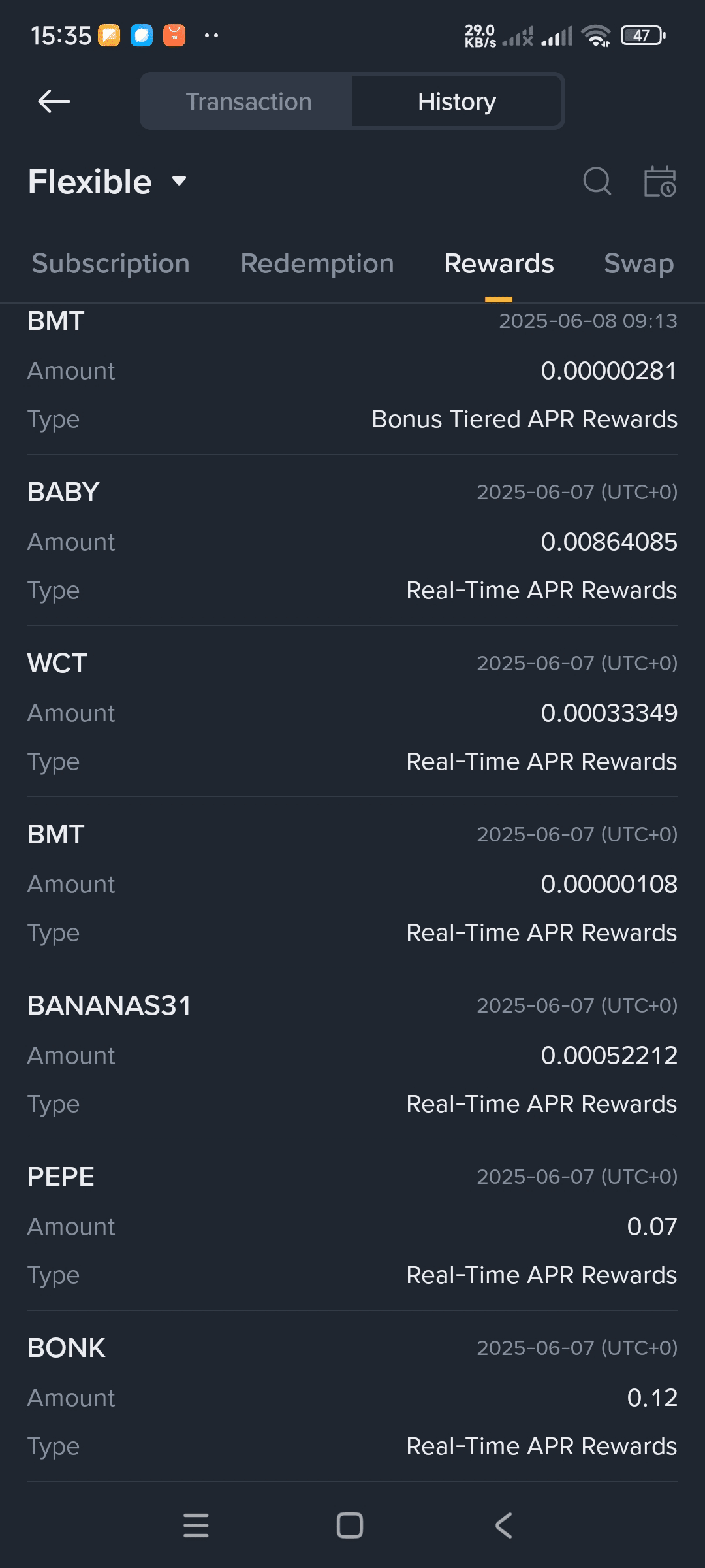 Je voulais juste partager une mise à jour rapide sur mes gains crypto d'hier. Comme vous pouvez le voir sur la capture d'écran, j'ai reçu diverses récompenses de mes avoirs "Flexibles", y compris $BMT , BABY, WCT, $BANANAS31 , PEPE et $BONK .