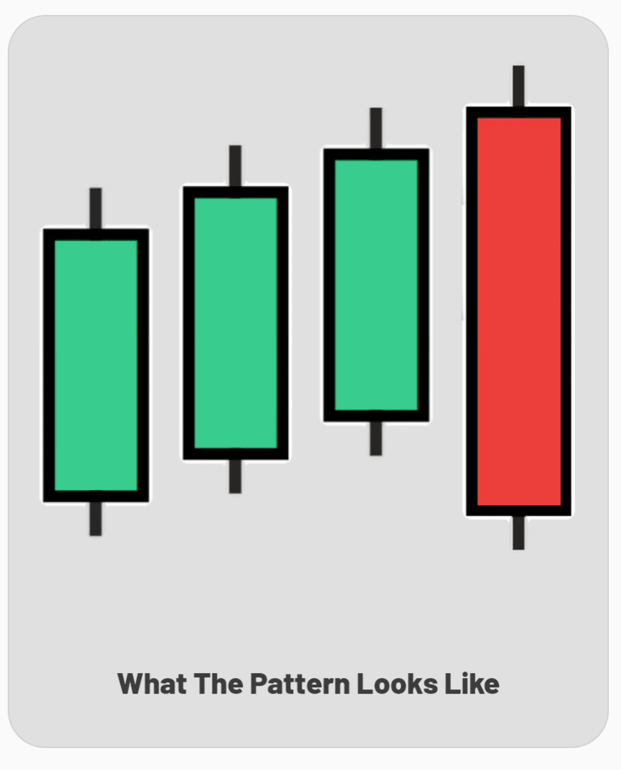 Quatrième bougie : Contrairement à la tendance, la quatrième bougie est une longue bougie baissière (rouge/noire). Elle s'ouvre plus haut que la clôture de la troisième bougie mais procède ensuite à "frapper" en arrière, englobant les corps réels des trois bougies haussières précédentes et clôturant en dessous de l'ouverture du premier jour. Cependant, elle n'a pas besoin de couvrir les ombres des bougies précédentes.