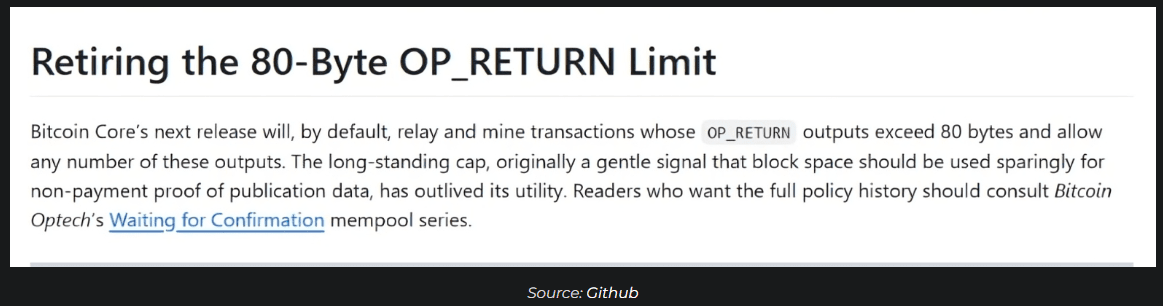 Cependant, avec la fusion proposée, la version 30 supprimera effectivement la barrière stricte de 80 octets. Elle permettra plutôt aux champs OP_RETURN de croître jusqu'à la taille maximale du bloc (près de 4 Mo), à condition que les opérateurs utilisent les paramètres par défaut.