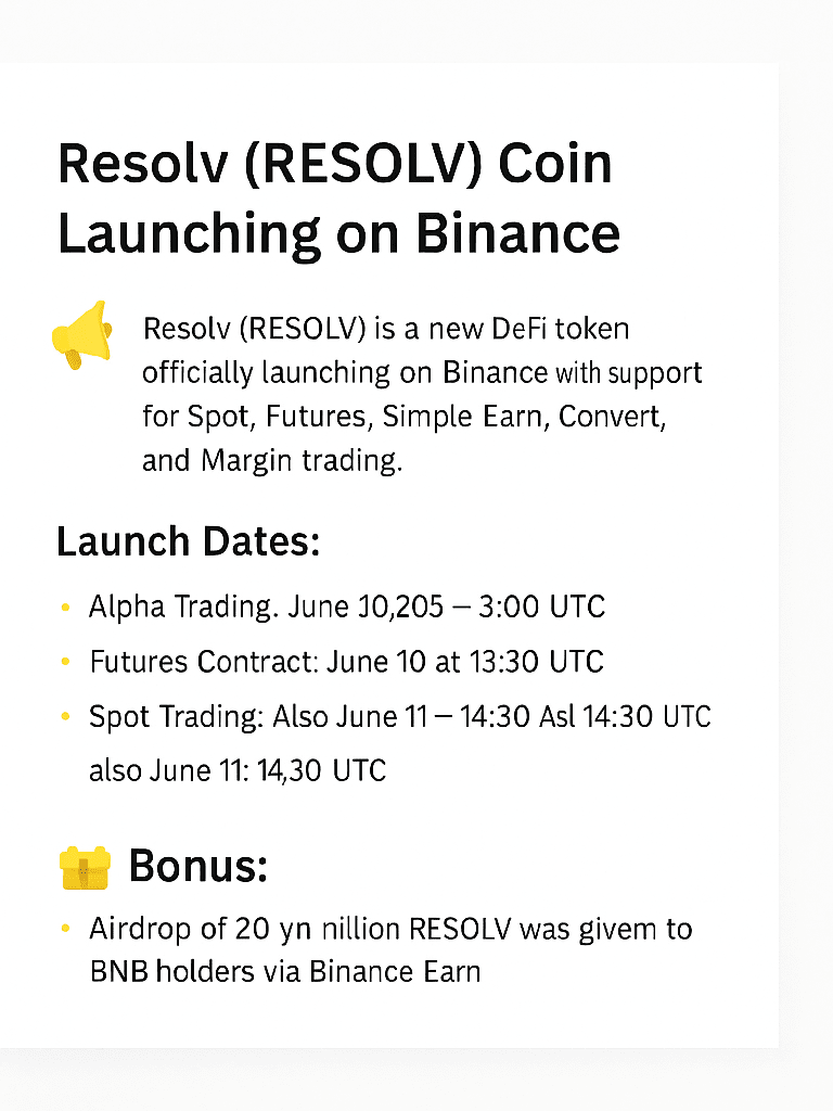 Resolv (RESOLV) est un nouveau token DeFi lancé officiellement sur Binance avec support pour le trading Spot, Futures, Simple Earn, Convert, et Margin.#BinanceHODLerRESOLV #BinanceHODLerRESOLV