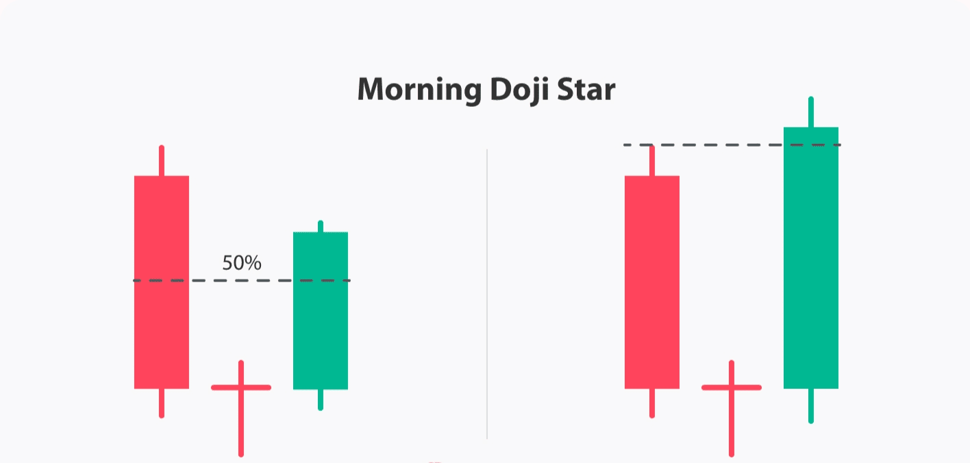 3.Force : Un Doji d'Étoile du Matin vert est considéré comme plus fort qu'un Doji d'Étoile du Matin rouge car le sentiment haussier est plus prononcé dans le premier.