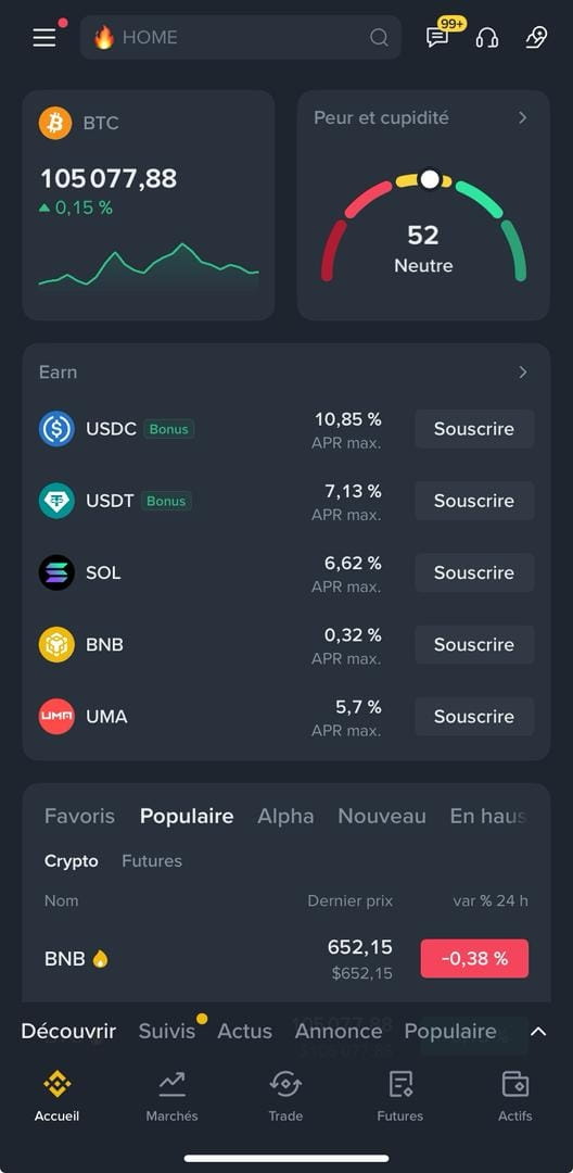 Perso, j’ai mis les widgets Coin Spotlight, Fear & Greed Index, Simple Earn Flexible et Coin List en haut de mon tableau de bord. Cela me permet de repérer rapidement les tendances, suivre le sentiment du marché, consulter les nouvelles offres sur le simple earn flexible (oui je suis fan de Binance Earn et consulter la liste des cryptos en un clin d'œil.