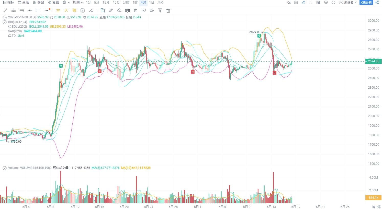 【Analyse quotidienne】: Structure de tendance : Depuis la rupture de 1730 début mai, l'ETH a formé une forte tendance haussière, atteignant un maximum de 2879, avec un récent retour à 2450 montrant des signes de stabilisation.