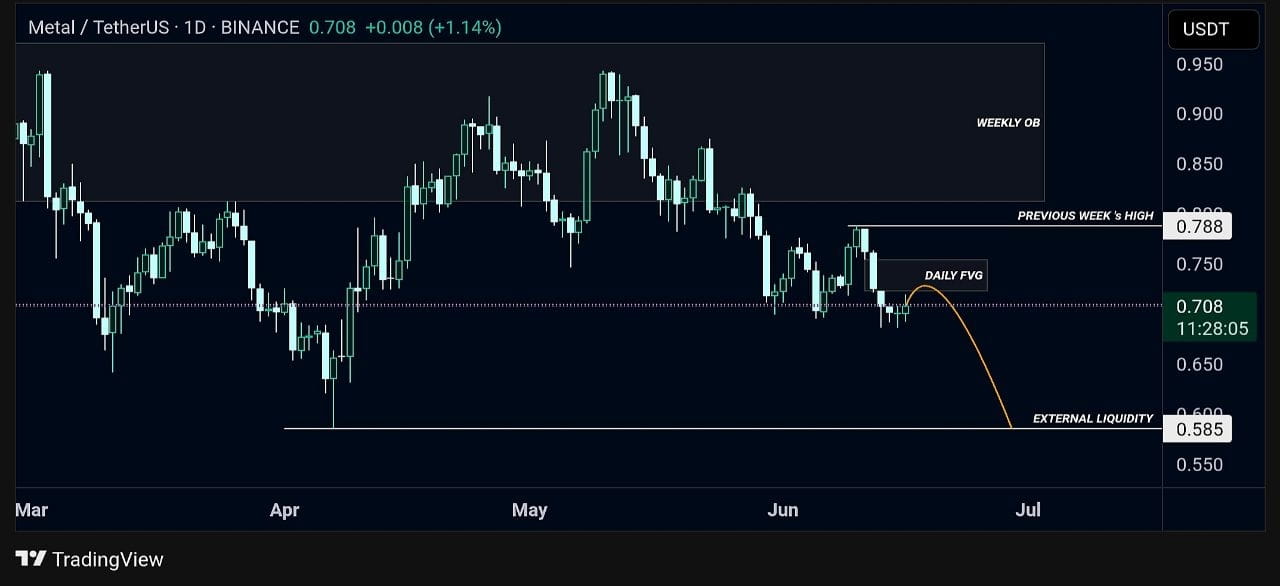 #Metal ( $MTL ) montre des signes d'une opportunité de vente potentielle, avec le prix touchant une zone de Fair Value Gap (FVG) quotidienne — souvent une zone clé où l'argent intelligent intervient.