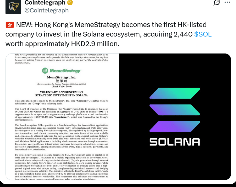 âą Le 16 juin, MemeStrategy a achetĂ© 2 440 SOL en utilisant des fonds de trĂ©sorerie de l'entrepriseâmarquant un pivot stratĂ©gique par rapport Ă une exposition uniquement au Bitcoin.