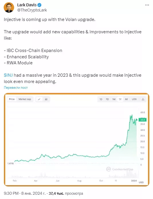 Le prix actuel de l'INJ est de 37,81 $, après avoir perdu 10,1 % au cours des dernières 24 heures, tout en maintenant une croissance hebdomadaire de 5 %.
