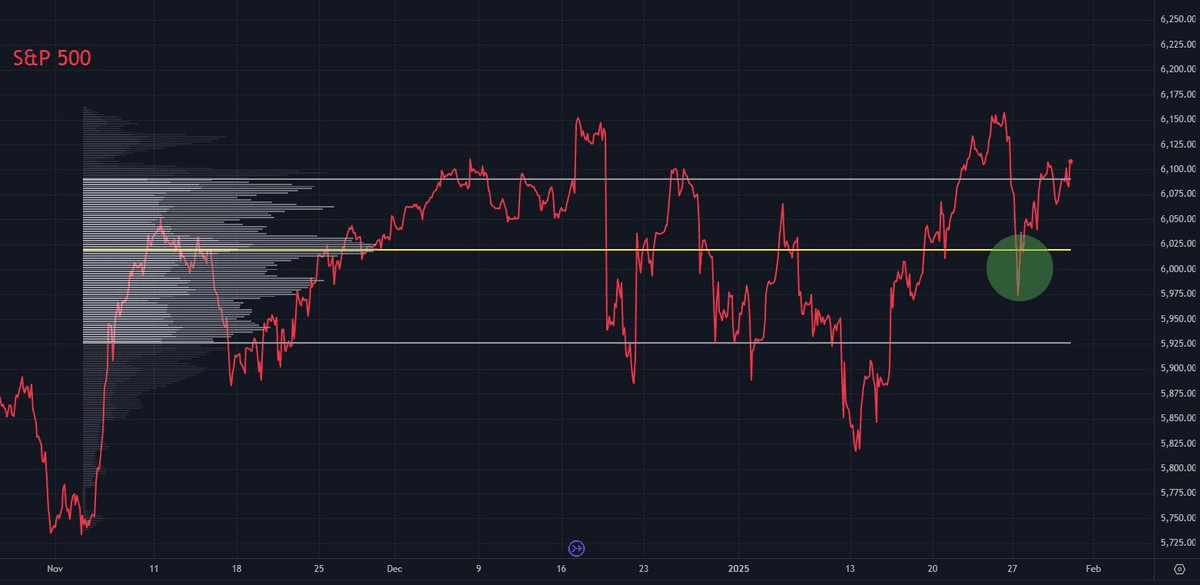 Ă la fois le S&P 500 et le bitcoin ont retestĂ© le Point de ContrĂŽle de la plage (đĄ) et ont rebondi fortement hors de la zone de valeur (signe de force).