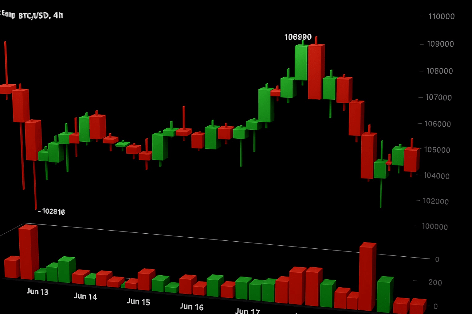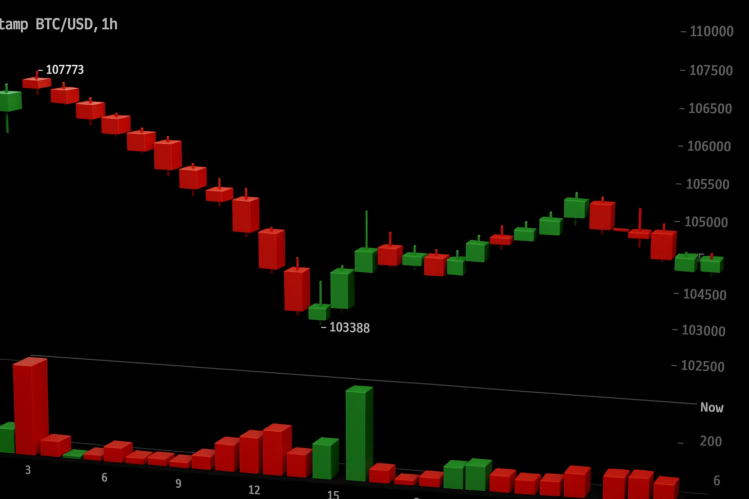 Sur le graphique d'une heure, le Bitcoin est tombé de 1,07,773 à 1,03,388 — une chute claire.