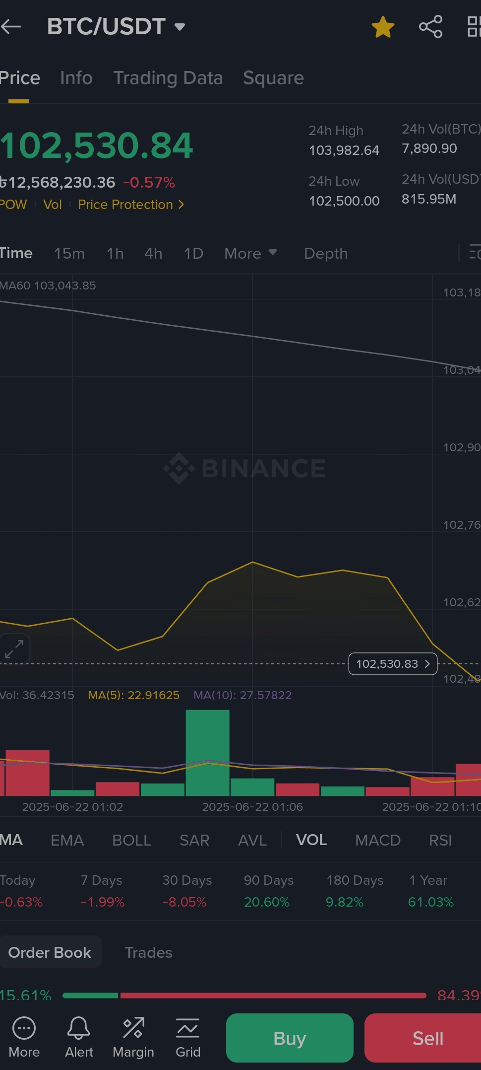 Le BTC est en baisse de 0,57 %, avec un volume de 24H de plus de 815M USDT. C'est un signe d'activité - soit d'accumulation, soit de distribution.