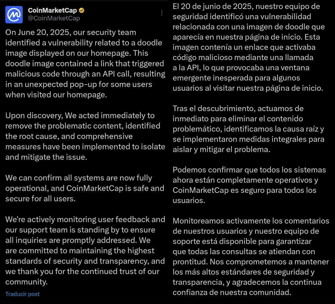 Le 20 juin 2025, l'écosystème des cryptomonnaies a connu un moment de tension. CoinMarketCap, la plateforme de référence pour des millions d'investisseurs et d'enthousiastes, a été compromise. Ce n'était pas un hack massif avec perte directe de fonds dans ses systèmes, mais quelque chose de plus subtil et, en même temps, insidieux : une vulnérabilité dans son interface qui a permis l'injection de code malveillant, ouvrant la porte à une attaque de phishing ciblant les utilisateurs. Cet incident, bien qu'immédiatement contrôlé, est un cruel rappel que la dernière ligne de défense dans le monde volatile des cryptos, c'est vous.