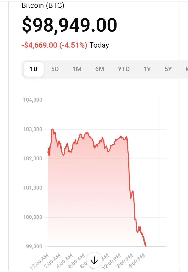 Bitcoin (BTC), le roi des cryptomonnaies, vient de connaĂźtre un effondrement dramatiqueâprovoquant des ondes de choc sur les marchĂ©s financiers mondiaux. AprĂšs avoir atteint des sommets record supĂ©rieurs Ă 111 000 $ il y a Ă peine quelques semaines, BTC a chutĂ© de prĂšs de 12 % en une seule journĂ©e, tombant en dessous du niveau de 99 000 $ et dĂ©clenchant une panique gĂ©nĂ©ralisĂ©e parmi les investisseurs.
