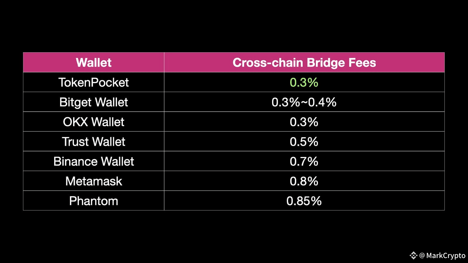 Lowest Fee Tier (0.30%): TokenPocket, Bitget Wallet, OKX Wallet (lower threshold)
