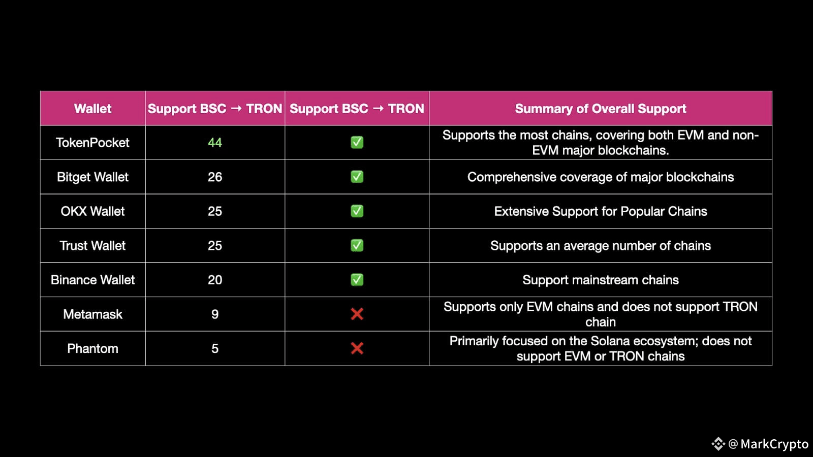 Limited Support: MetaMask (no TRON), Phantom (Solana/Ethereum-focused)