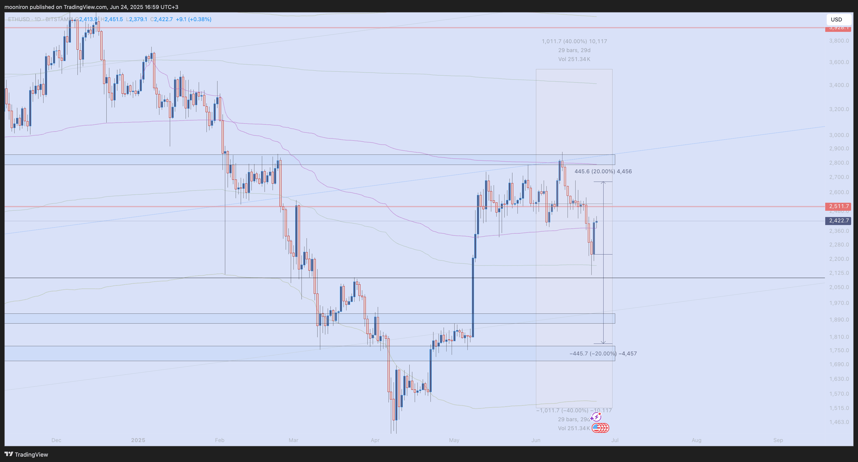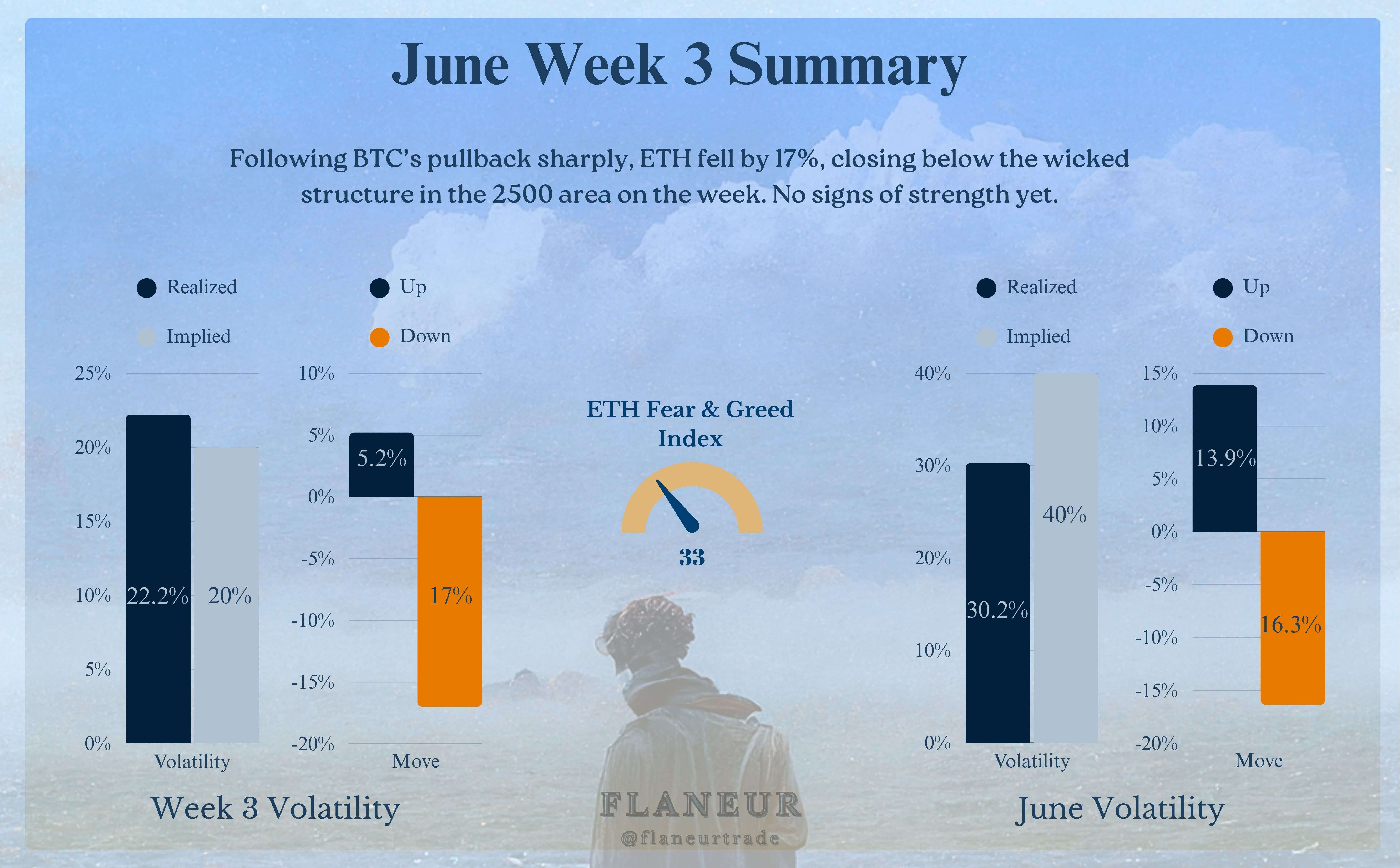 Il a cassé à travers cette structure "wicky" sur le graphique hebdomadaire avec des ventes intenses. Cependant, hier, il s'est rapidement redressé avec le BTC et est rentré dans cette plage. La volatilité implicite hebdomadaire est dans la plage de 1780 $ à 2670 $. Comme il n'a pas encore complètement retrouvé sa force, je garde mon attention sur le BTC.