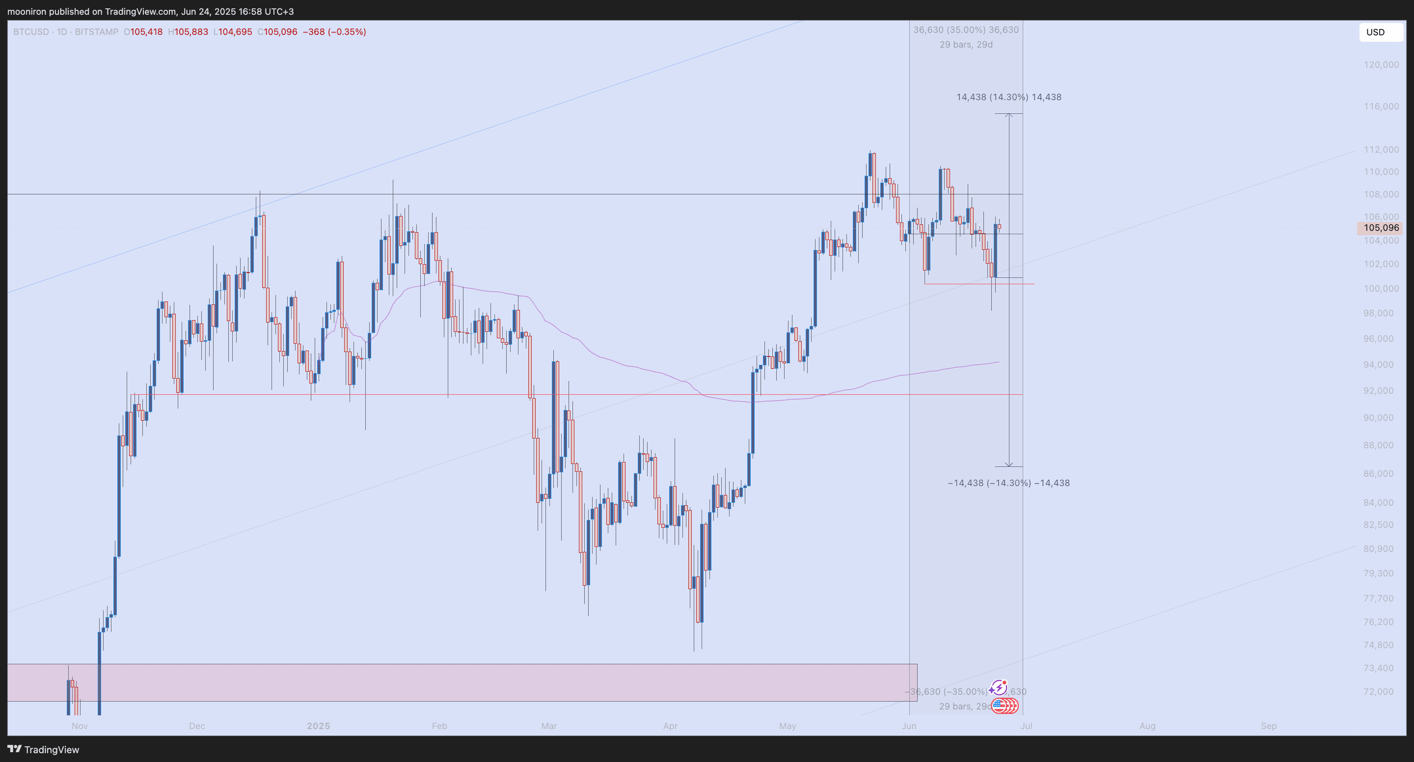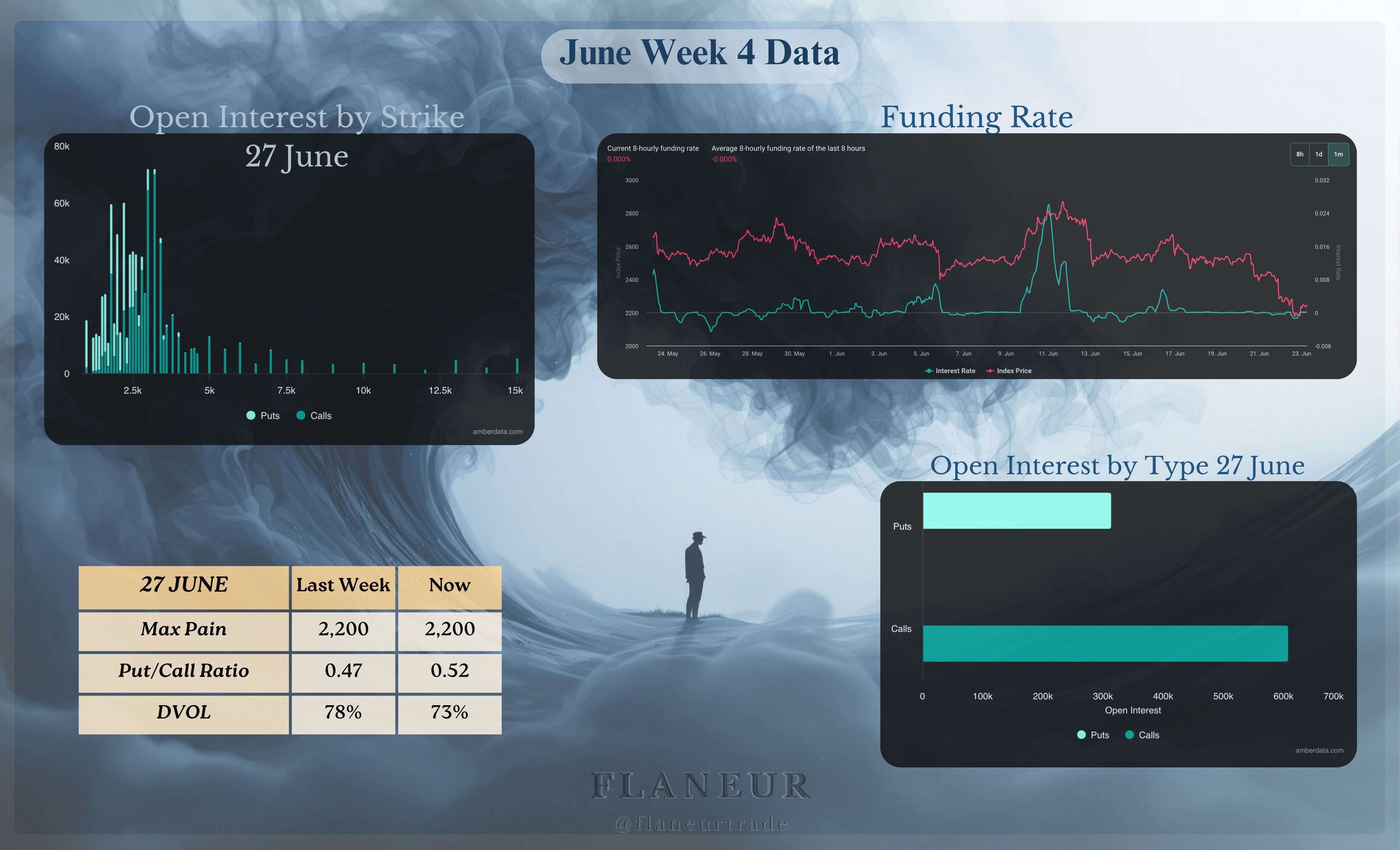 La semaine dernière, j'ai mentionné que bien que je m'attendais à un nouveau ATH, j'étais hésitant en raison des risques anticipés. Avec l'ouverture hebdomadaire d'hier, le prix a fait un joli mouvement en repassant au-dessus de l'ouverture mensuelle. Je serai hésitant à prendre des positions courtes tant que le prix ne se négocie pas en dessous de la région de 103,5k $. Étant la dernière semaine du T2, je suis tiraillé entre penser que cela pourrait être soit très volatil, soit très calme. Je vais probablement éviter de prendre beaucoup de transactions jusqu'à ce que je voie des mouvements plus décisifs. La plage de volatilité implicite de cette semaine est comprise entre 86k $ et 115k $.