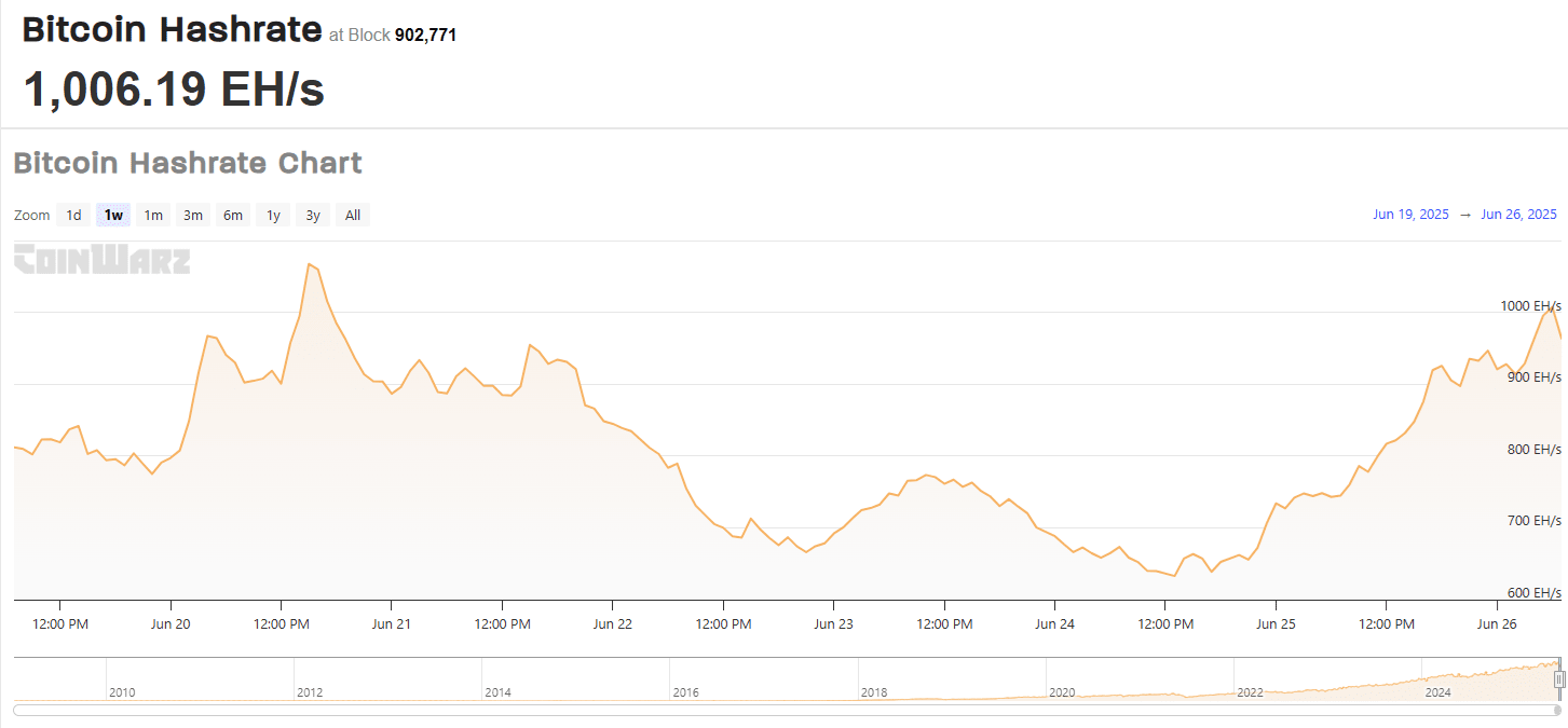 Mais en une seule journée, un retournement soudain a eu lieu - le hashrate a augmenté de plus de 30 %, revenant à des valeurs supérieures à 1000 EH/s.