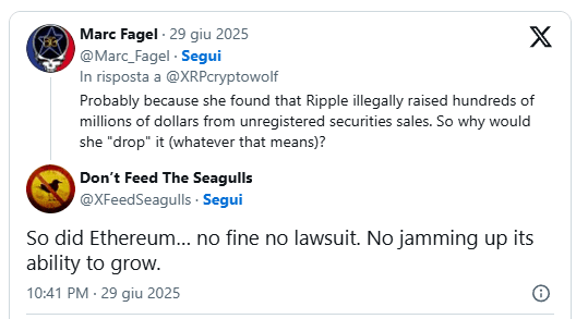 À un utilisateur qui a demandé pourquoi le même sort n'est pas tombé sur Ethereum (qui a vendu des jetons via ICO tout comme XRP, ndlr), Marc Fagel a expliqué que le juge ne pouvait pas le faire : son rôle est limité au cas spécifique qui lui est présenté, et dans cette procédure, Ethereum n'était pas impliqué. Par conséquent, un prononcé direct sur la nature juridique de l'ETH ne pouvait pas être attendu.