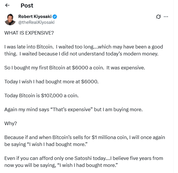 Actuellement, il se négocie autour de 107 000 $ à 107 580 $. Kiyosaki a déclaré que son démarrage lent était dû au fait qu'il ne comprenait pas complètement l'argent numérique à l'époque.