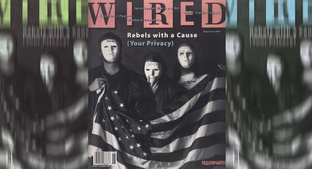 Hughes, Gilmore et May étaient les individus masqués sur la couverture de Wired, février 1993. Image par CryptoArtCulture