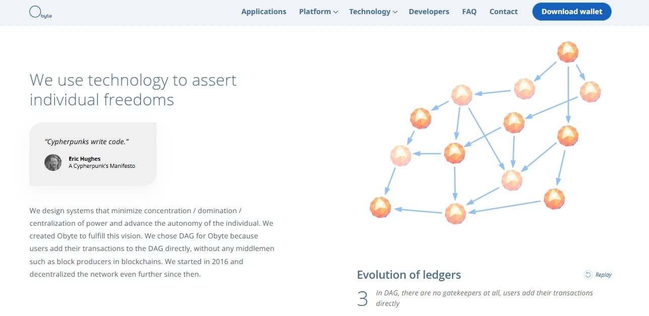 La décentralisation ne s'est pas arrêtée là. Les systèmes de Graphes Acycliques Dirigés (DAG) sont la prochaine étape de la décentralisation. Un système cryptographique basé sur un DAG comme Obyte n'a pas de mineurs ni d'intermédiaires. Il n'a pas de blocs non plus. Seuls les Fournisseurs d'Ordre (OP) dont les transactions servent de points de passage pour ordonner tout le reste — mais ils n'ont pas d'autres pouvoirs et ne sont pas nécessaires pour « accepter » les transactions, comme les mineurs de Bitcoin. En éliminant des centres de pouvoir aussi importants que les mineurs, le DAG réalise une distribution plus équitable du pouvoir que les blockchains.