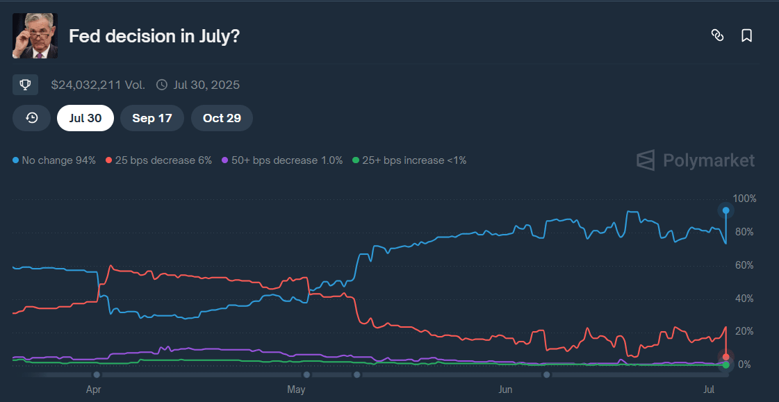 Les données de Polymarket montrent qu'il y a 94% de chances que la Fed maintienne les taux d'intérêt inchangés à la suite de la réunion du FOMC du 30 juillet. Pendant ce temps, les données de CME FedWatch montrent que les traders ont également abandonné leurs paris sur une réduction des taux ce juillet.