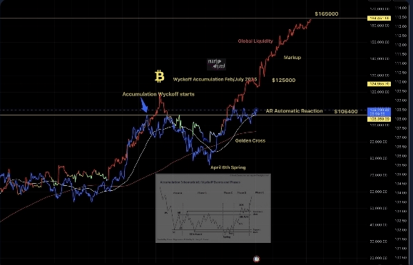 👉$BTC se négocie près de 109 330 $, tandis que les modèles techniques basés sur l'accumulation Wyckoff indiquent maintenant une projection de prix de 165 000 $. Le modèle, actif depuis février 2025, s'aligne avec les phases de marché précédemment observées dans les cycles crypto à long terme. La structure de hausse et les prévisions de liquidité mondiale soutiennent maintenant cette poursuite à la hausse.