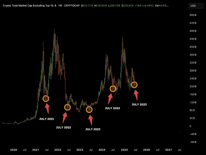 Historiquement, les altcoins ont rebondi sur la ligne de support chaque fois avant une saison d'altcoins.