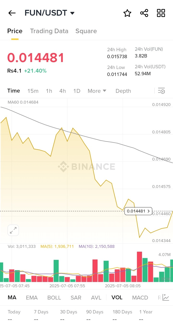 FUN/USDT connaît actuellement une forte hausse haussière, avec un volume solide confirmant le mouvement. Le prix est proche de la MA60, montrant de la volatilité avec un potentiel pour soit une nouvelle cassure, soit un recul à court terme.