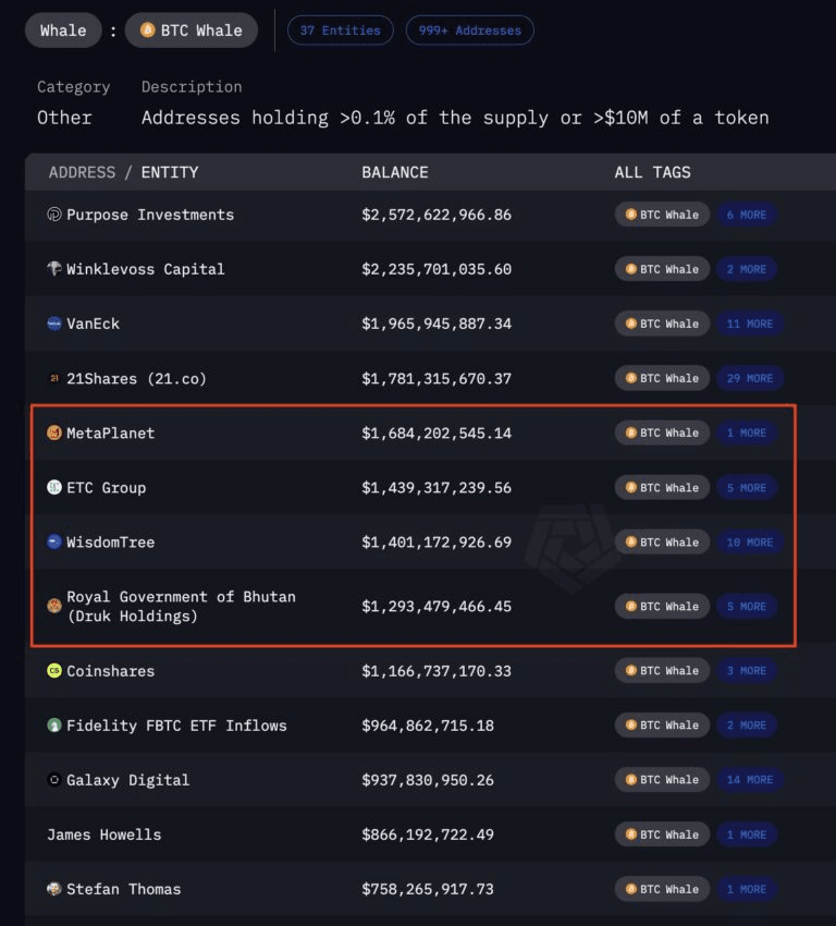 Selon les derniers rapports, les 15 555 BTC de Metaplanet ont dépassé l'ensemble de la collection de Bitcoin du Bhoutan, qui s'élève actuellement à près de 13 000. Arkham Intelligence a récemment partagé une mise à jour dans un post X, révélant les avoirs BTC actuels de Metaplanet et du Bhoutan.