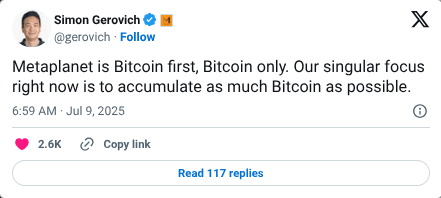 Il est intéressant de noter que l'entreprise prévoit également de tirer parti de ses avoirs en Bitcoin pour explorer davantage d'opportunités commerciales, y compris un achat potentiel de banque numérique. Comme nous l'avons rapporté hier, le volume de transactions de Metaplanet a atteint 12,8 milliards de dollars en juin, dépassant des entreprises japonaises majeures comme Toyota et Sony.