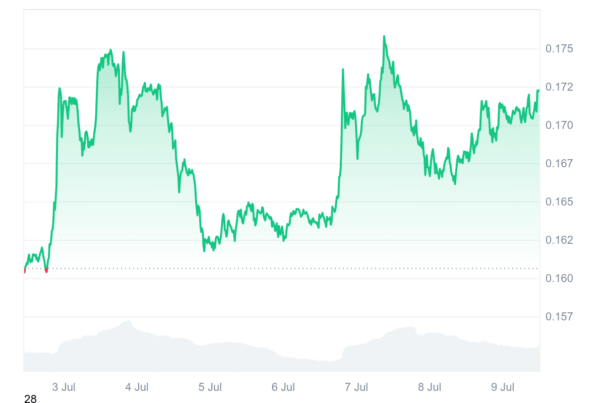 Au milieu de cette anticipation, le prix du Dogecoin a augmenté de plus de 2 % aujourd'hui et de 7 % au cours de la semaine. Avec cela, il se négocie à 0,1719 $ avec une capitalisation boursière et un volume de transactions de 25,79 millions de dollars et 879,4 millions de dollars.