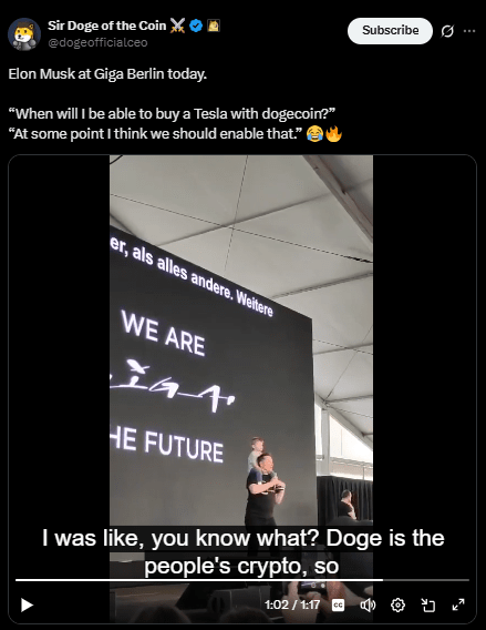 En mars 2024, Musk a déclaré que le DOGE pourrait être ajouté pour acheter des Teslas à un moment donné, mais n'a donné aucun calendrier. Beaucoup d'autres déclarations similaires suggèrent qu'il envisage des paiements avec le DOGE, donc les utilisateurs de crypto croient que l'application de paiement soutiendrait cela.